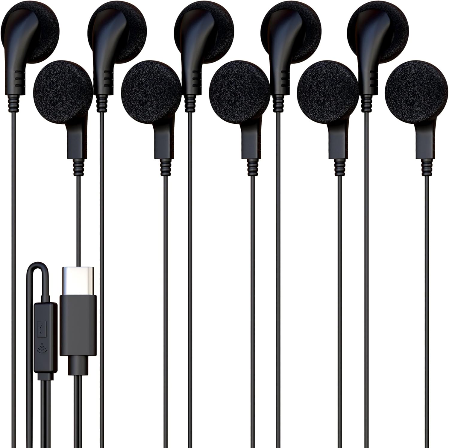 5 pack black USB-C wired earbuds with built-in microphone and 1-button controller for play, pause, calls, and voice assistant