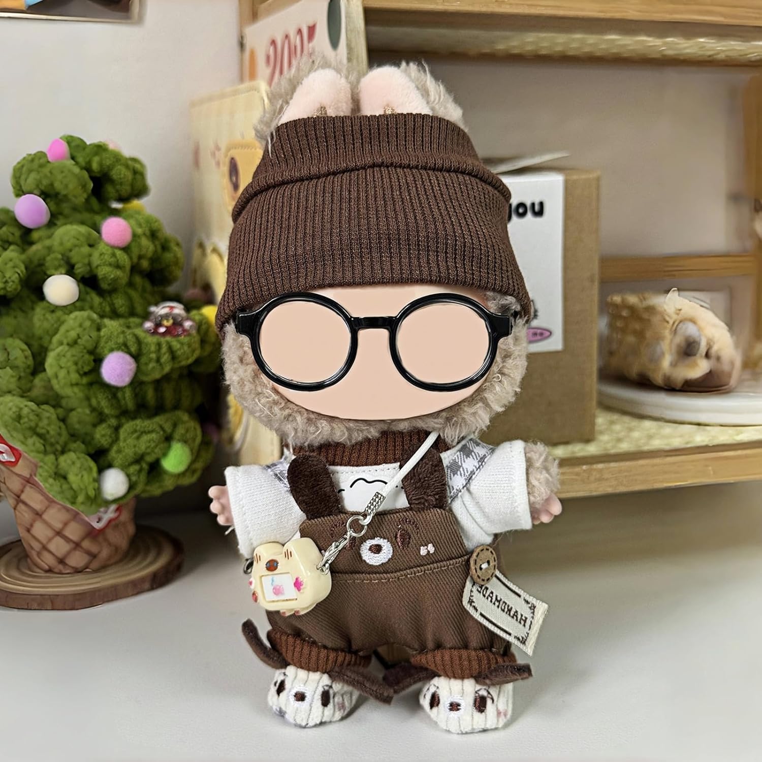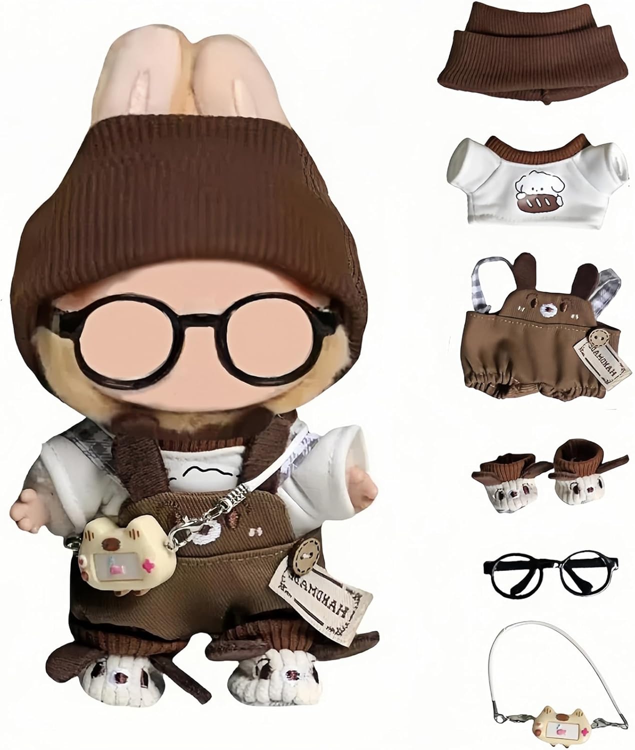 6-PIECE SET: Adorable brown plush doll clothing set includes overalls with puppy design, white t-shirt with bread print, beanie hat, shoes, glasses and mini camera.