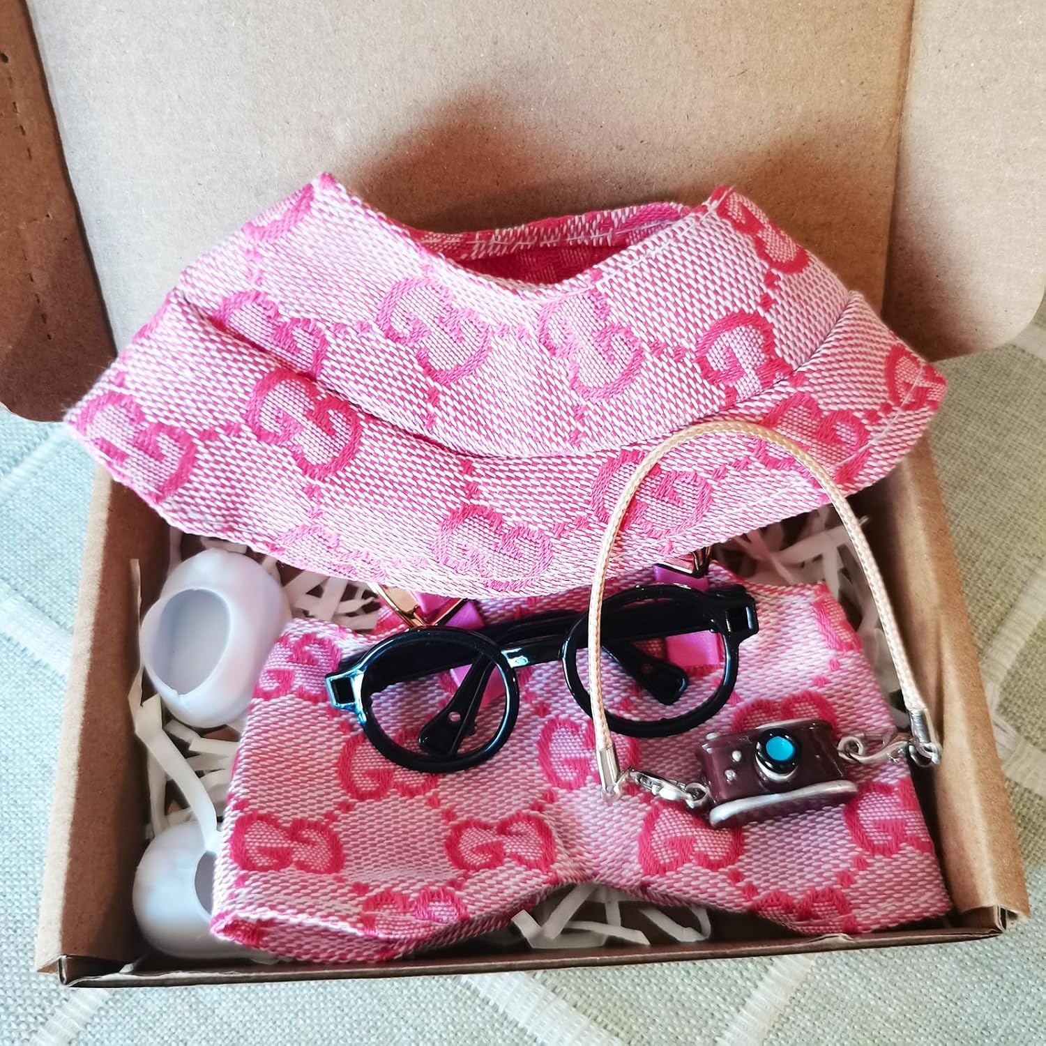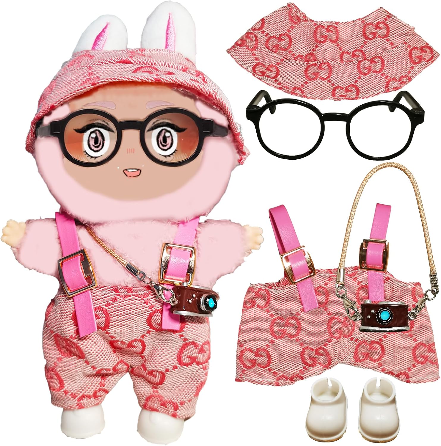 Elevate your 17cm / 6.7” LABUBU doll’s style with this 6-piece luxury outfit set, designed for both collectors and doll lovers. The set includes 1 suspender shorts+ 4 accessories: a pink hat, black glasses, a mini camera, and shoes – everything your doll needs for a chic, trendy-inspired look. Crafted with soft fabrics and detailed stitching, this mini doll clothes set is both stylish and durable. The hidden Velcro closure makes dressing quick and easy, perfect for imaginative dress-up play or elegant collector displays.