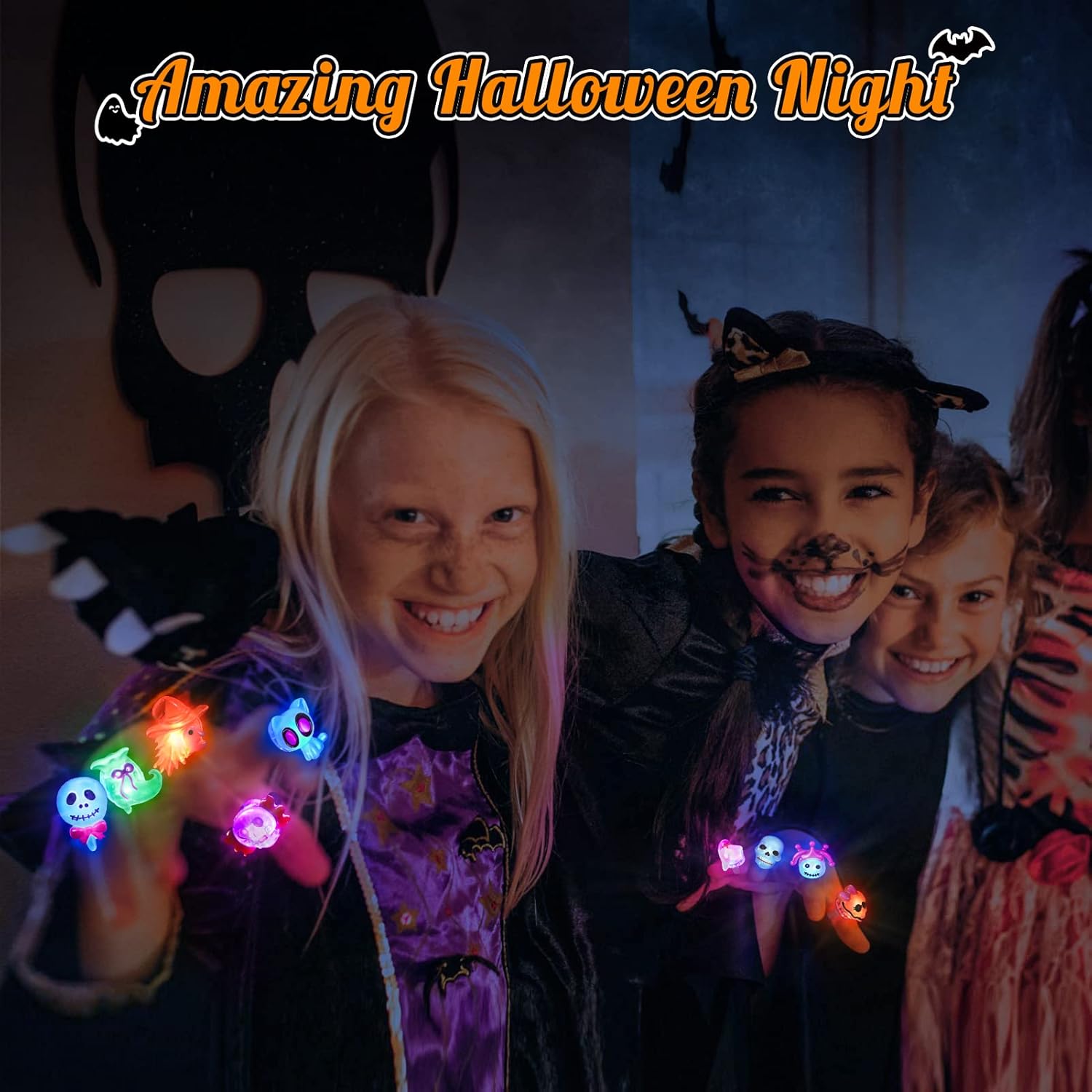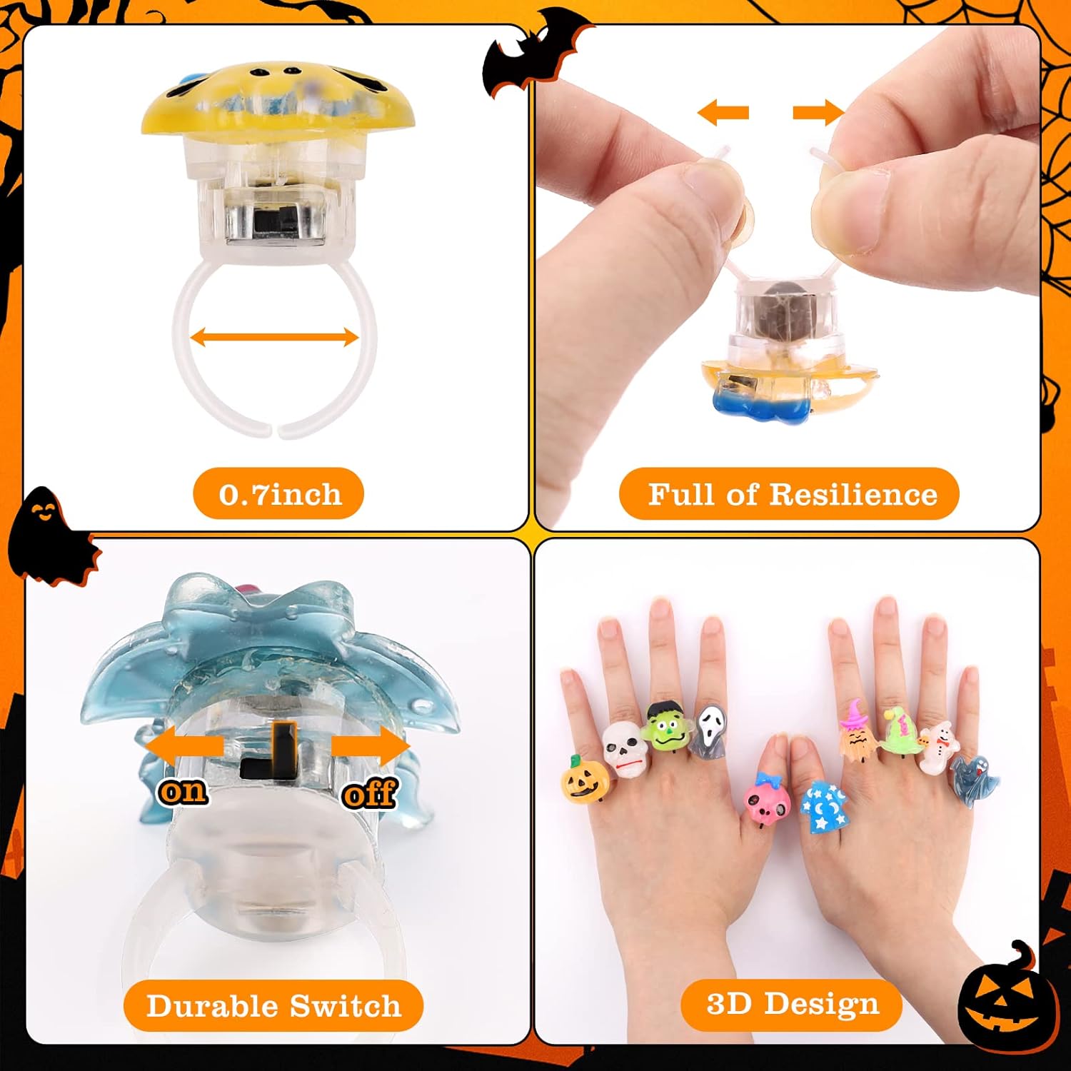 🎃【Various Patterns LED Rings】The only way to improve a toy is to make it glow-in-the-dark. The perfect halloween glowing ring, comes with 50 halloween element ring patterns, matching ghosts, skulls, pumpkins, black bats, witches etc. Give your kids a variety of options to combine with Halloween parties and shows. Make your boys girls an unforgettable Halloween time!