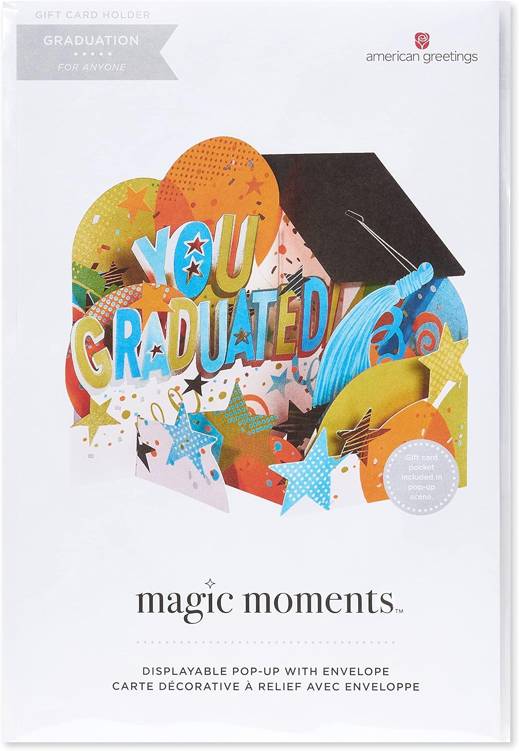 Congratulate a special graduate while also knocking their socks off with this awesome card from American Greetings! The card features a celebratory pop-up design with bold colors and a fun message. Festive design elements including stars, balloon and a grad cap, along with foil accents, making the art even more eye-catching and memorable. Displayable pop up card includes a spot to hold a gift card, perfect for any graduate. Graduating is a big deal, and this big and decorative card certainly reflects that! A white envelope is included and extra postage is required. Only from American Greetings.
