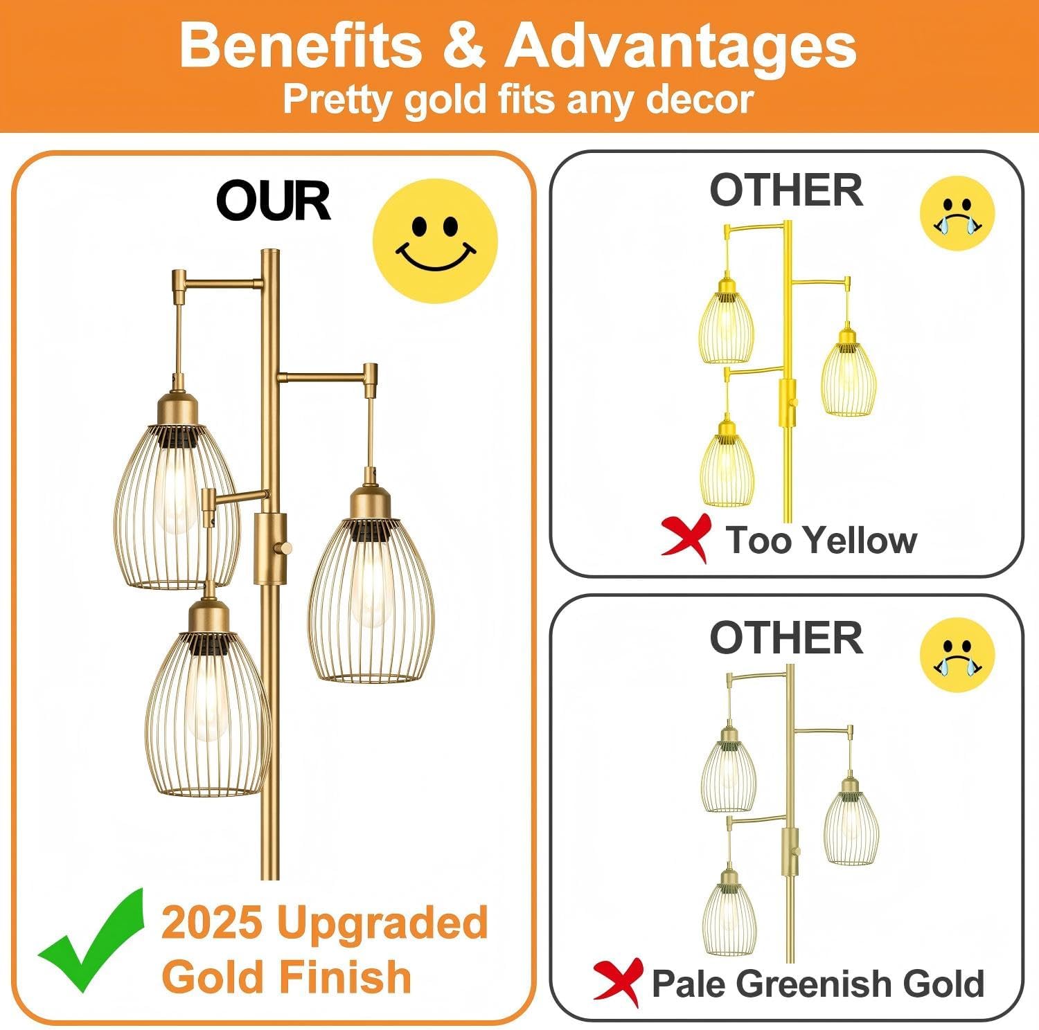 Exquisite And Sturdy Base: Our classic standing lamp is made of high-quality metal and has an elegant appearance.The three lightweight cages are durable and never bend.The pole is straight and perfectly connected to the base without swinging.The base is Heavy enough, Safe for your baby and pets.The base to provide a good stability from falling that can make sure safety and stable even on the carpet.