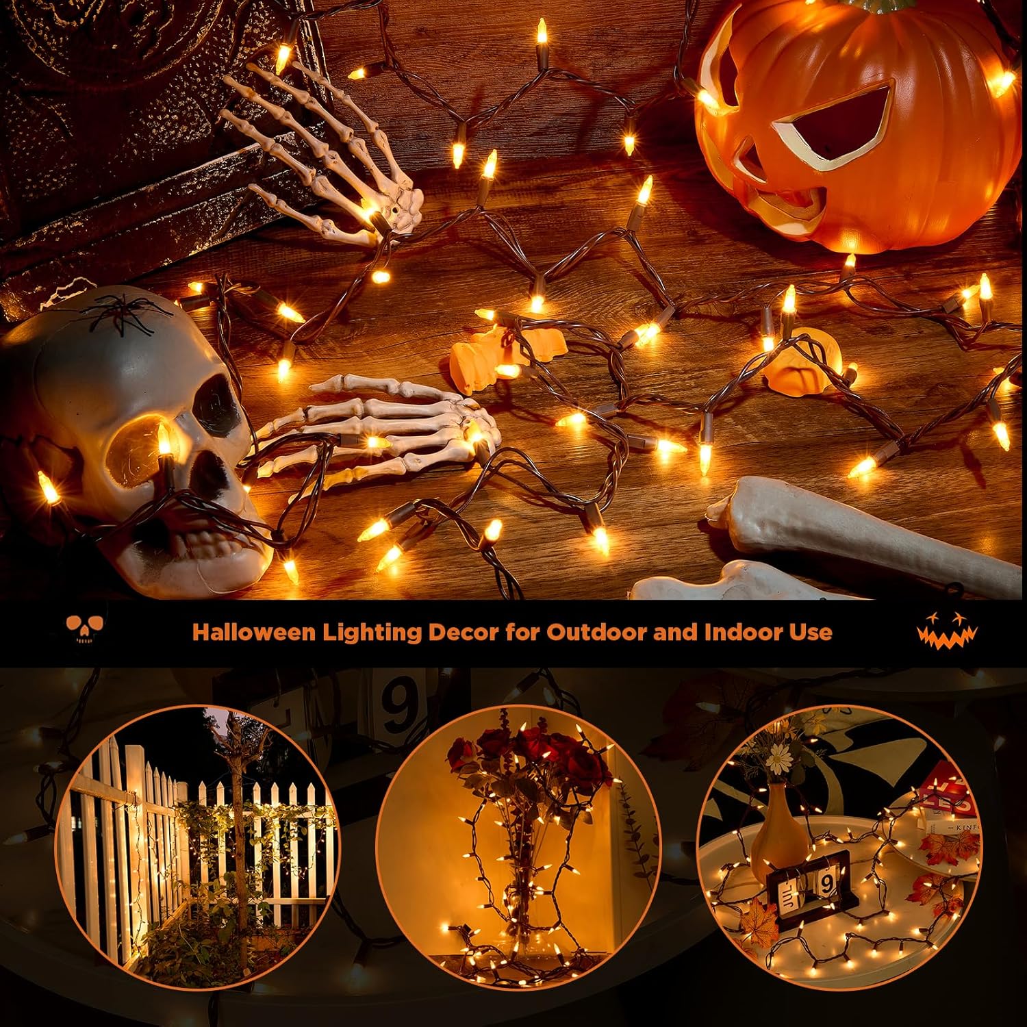 【Incandescent Halloween Lights】 : Our Halloween Lights includes 100 count warm gold bulbs, These mini string lights with 21 feet brown wires and strong insulated copper core,lighted length is 19.6 feet.Each bulb is 2.36 inch apart,19.6 inch lead wire,4 inch end connector. We value your convenience – the package includes 2 extra spare bulbs and 2 extra spare fuses ( basically no need to use)so the festivities never stop.