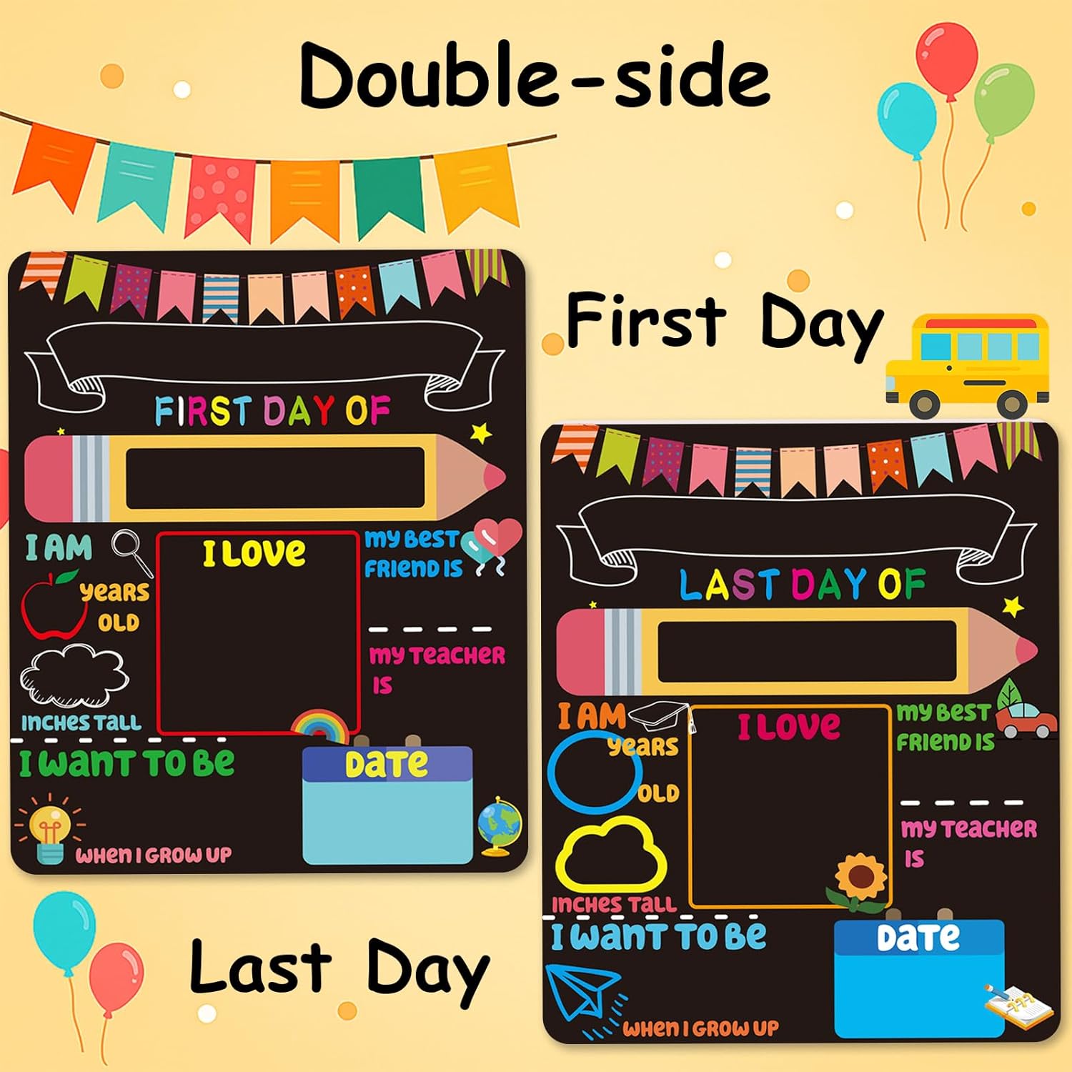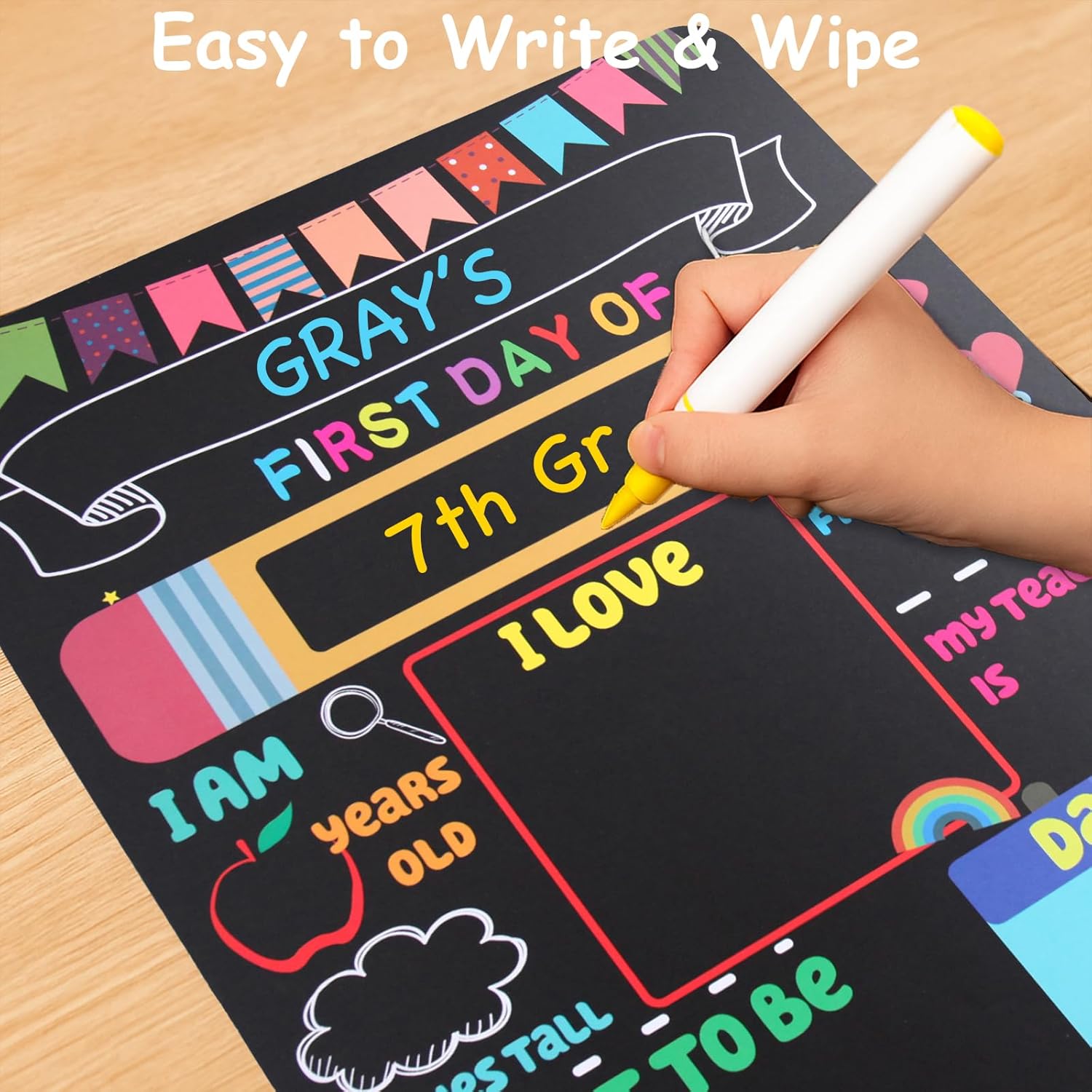EASY TO WRITE & CLEAN: Smooth, reusable surface works with liquid chalk markers or dry chalk (not included). Quickly fill in personalized info like age, grade, teacher, and best friend, then wipe clean and reuse year after year