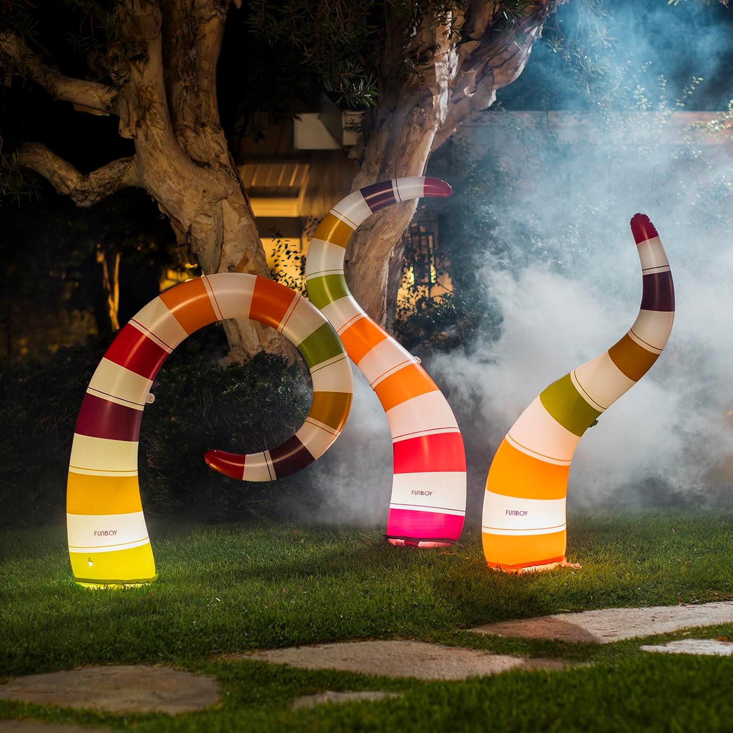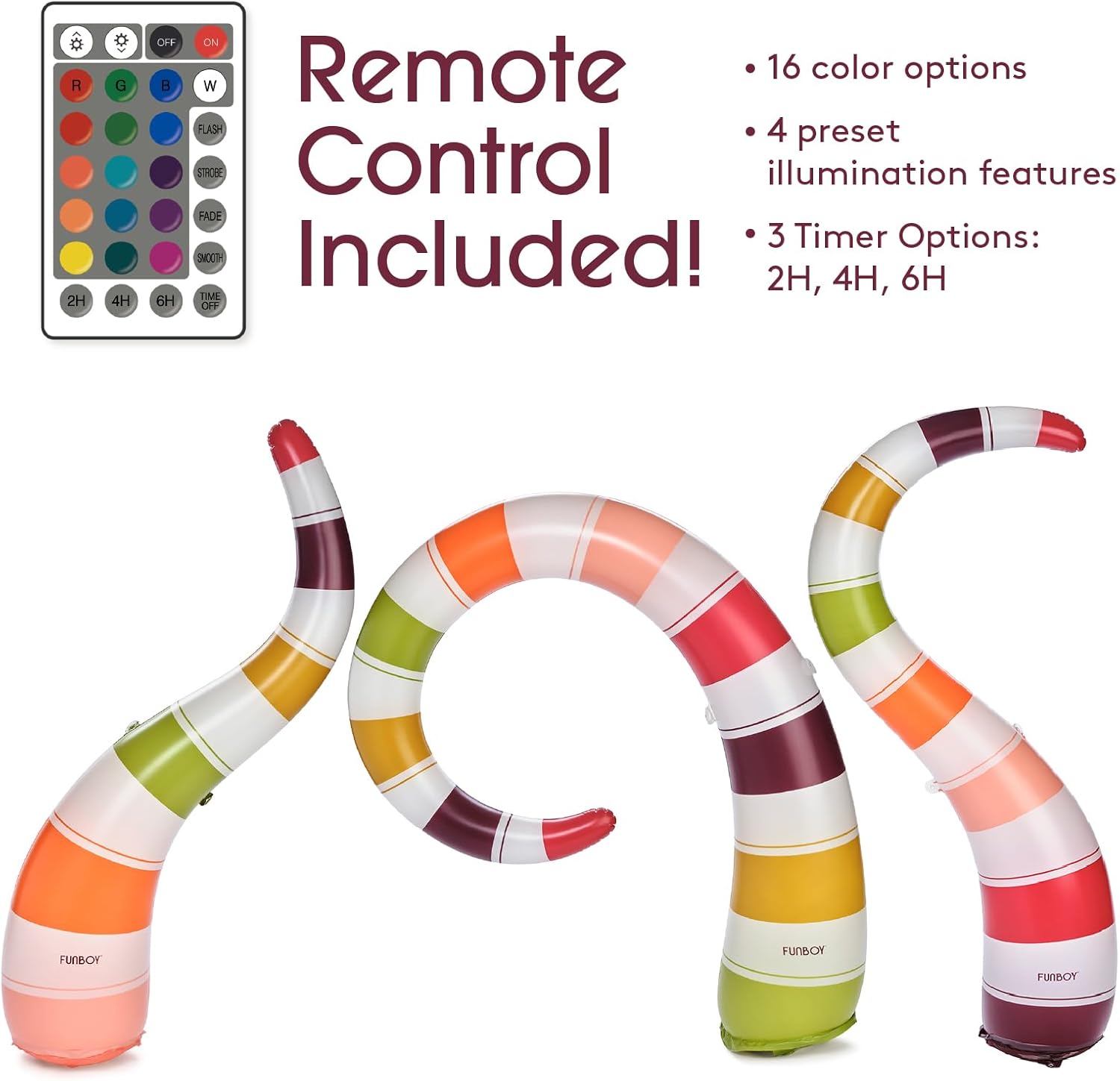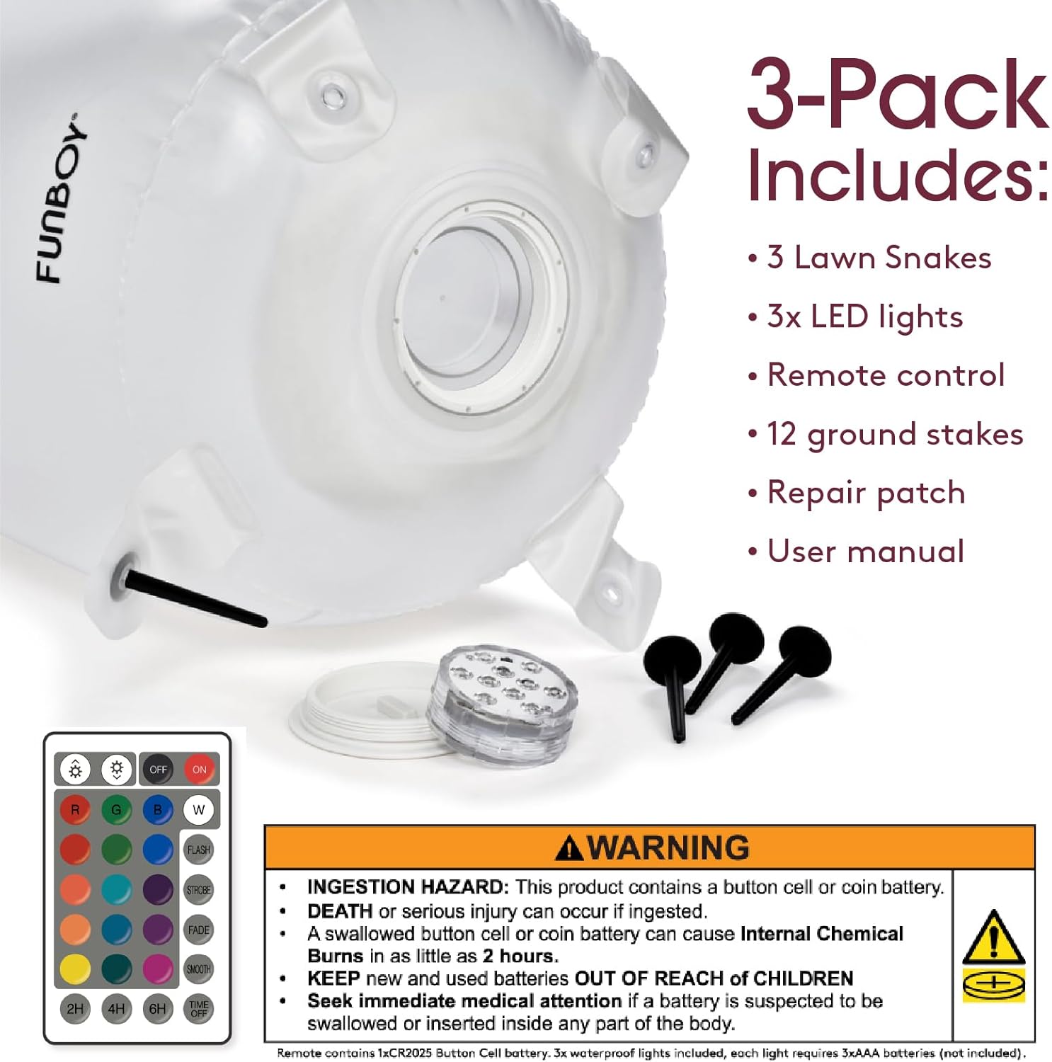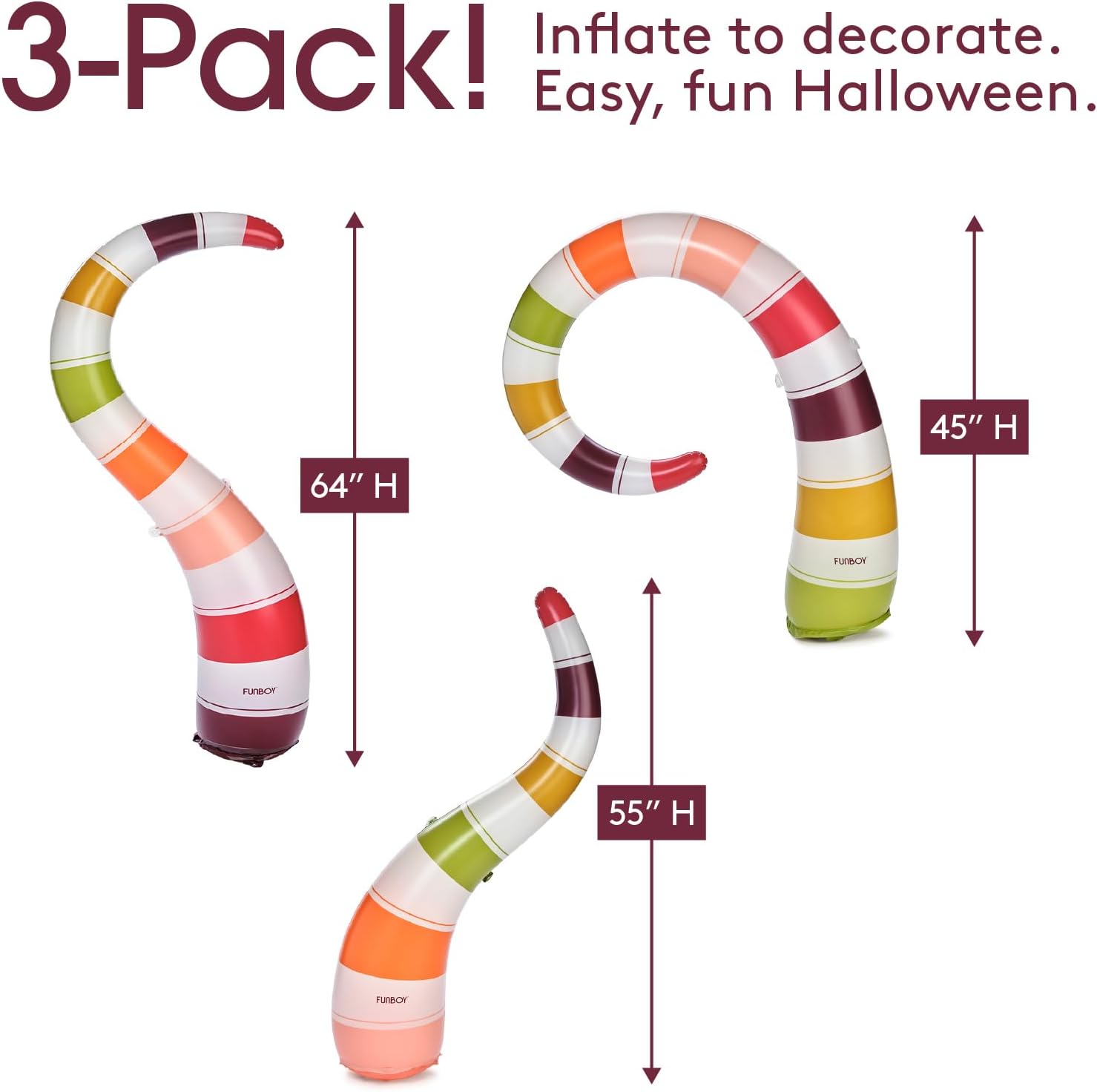 Pack of Three (3) Striped Inflatable Light-Up Giant Halloween Yard Snakes that crawl out of your lawn: Sized 57″, 45″, and 44” in height. Perfect for Halloween decor in any outdoor space.