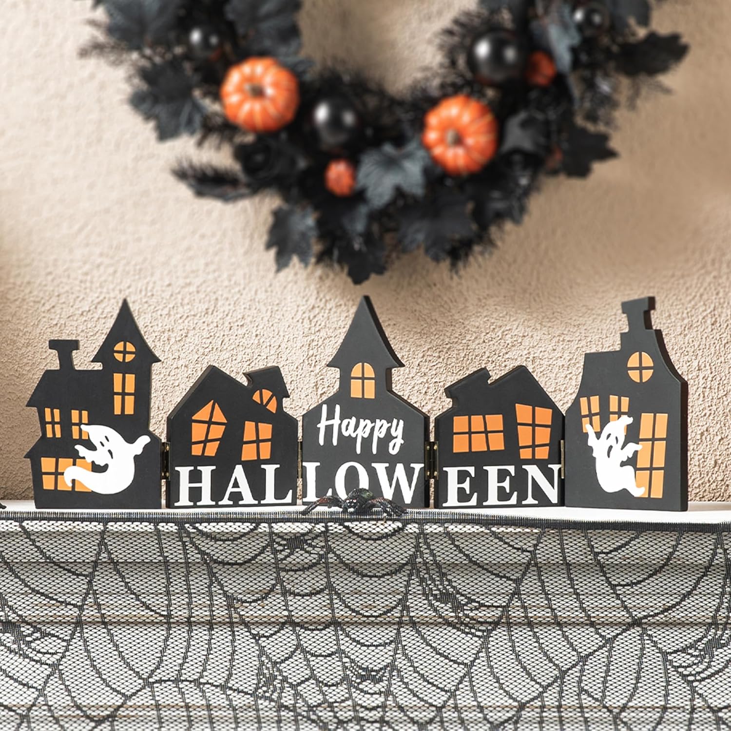 Add Scary Atmosphere to Halloween Decorations — The wooden haunted house are features black and orange colors scheme blends, the haunted house is printed with “Happy Halloween”, classic Halloween-themed withed elements like ghosts makes it a great addition for Halloween decor. Creates a gloomy atmosphere on your Halloween party decor.