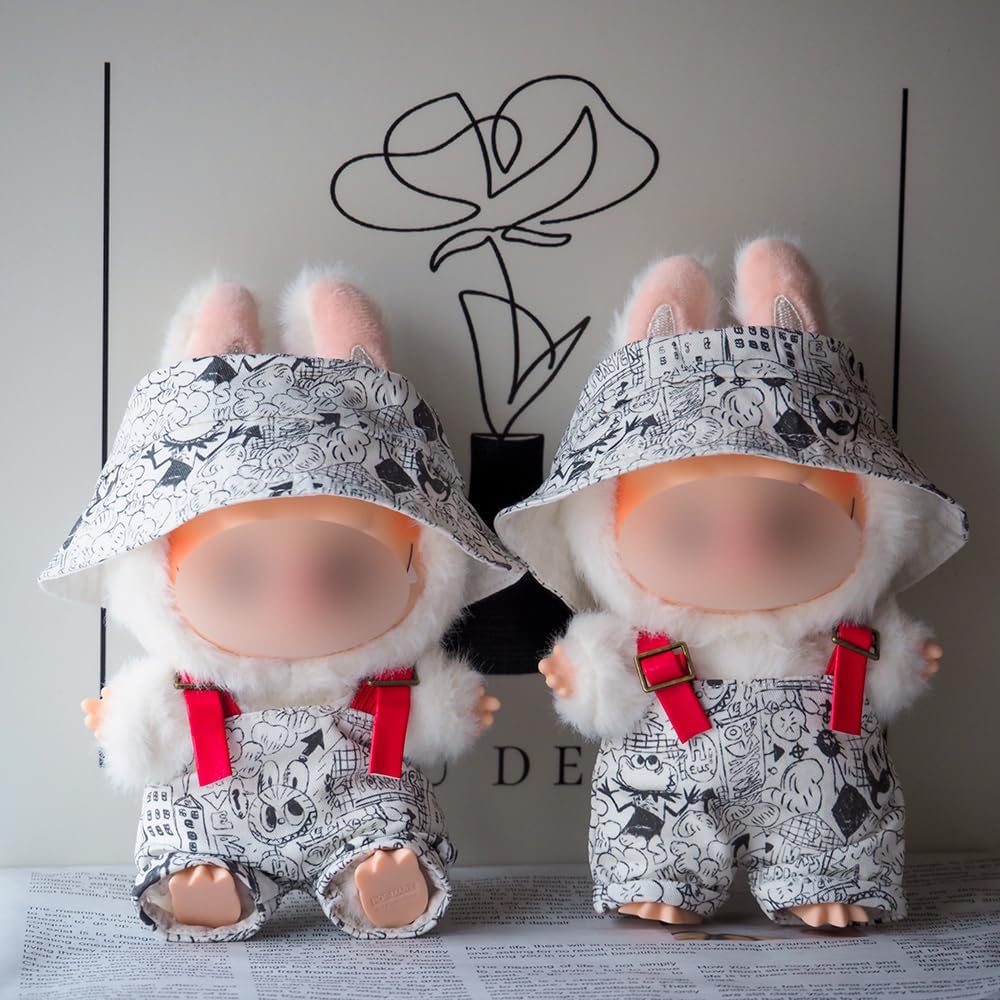 Dress up your 6.7-inch Labubu doll in this adorable white patterned outfit set. The ensemble includes a stylish bucket hat decorated with playful black and white drawings, perfectly matching the charming overalls.