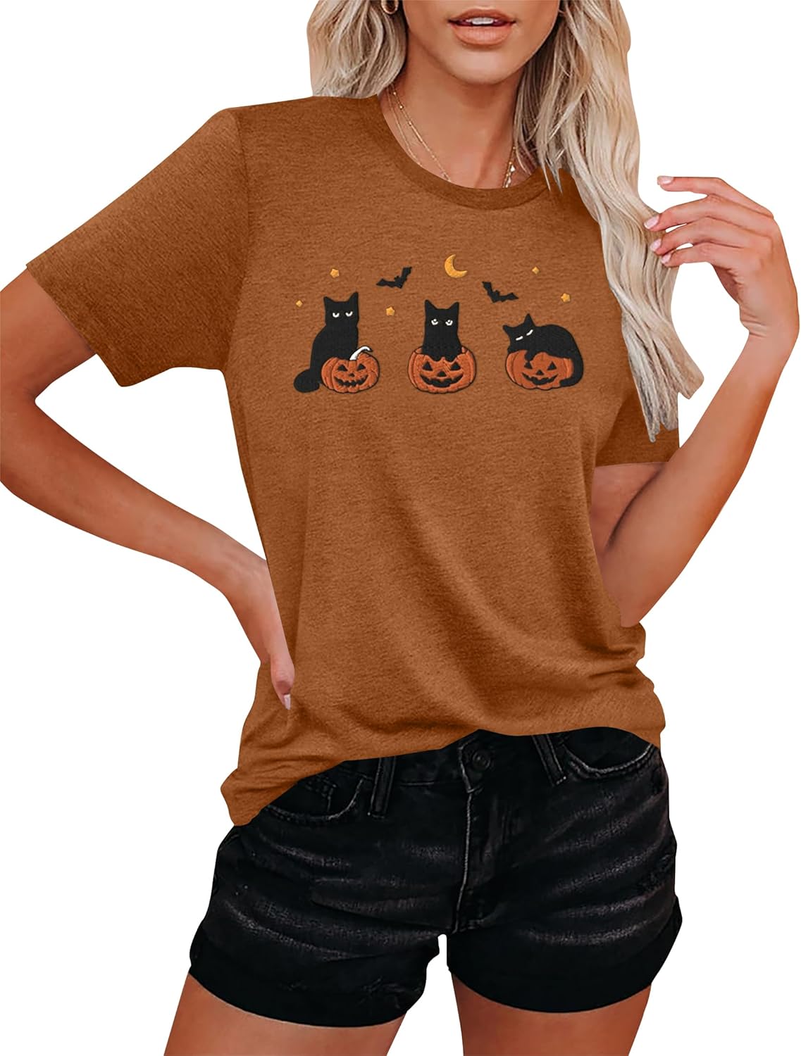 Ghost Halloween T-Shirt for Women Cute Embroidered Ghost Cat Graphic Tee Spooky Season Shirts Cat Lover Gift Casual Fall Tops
