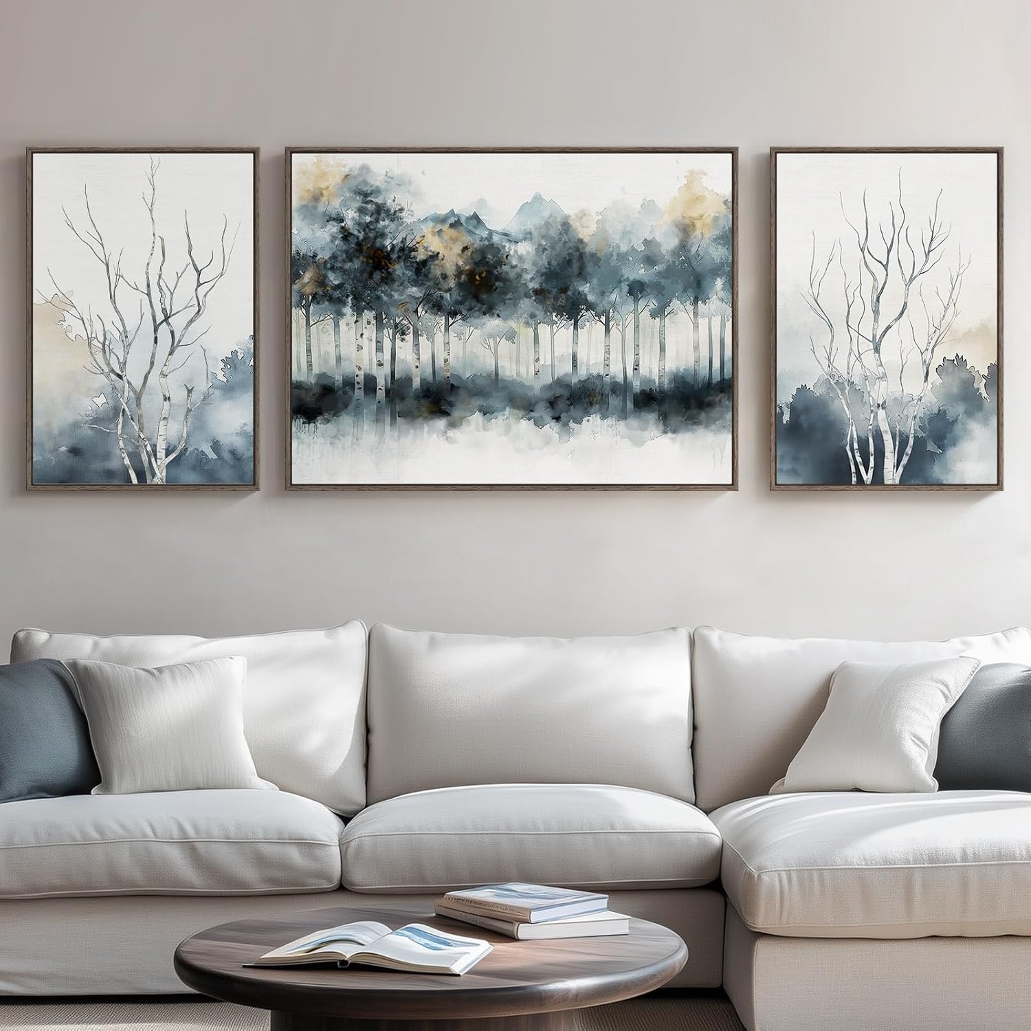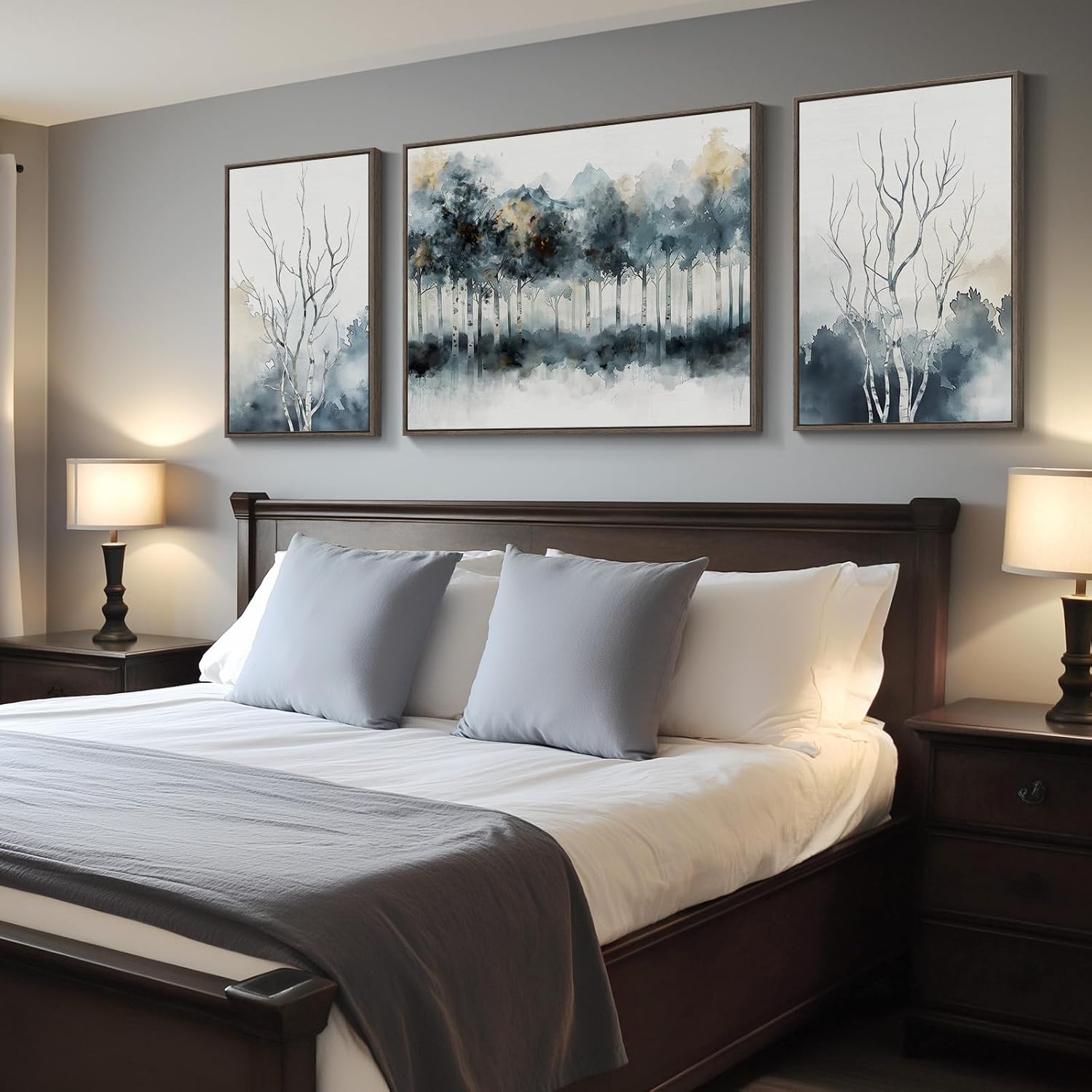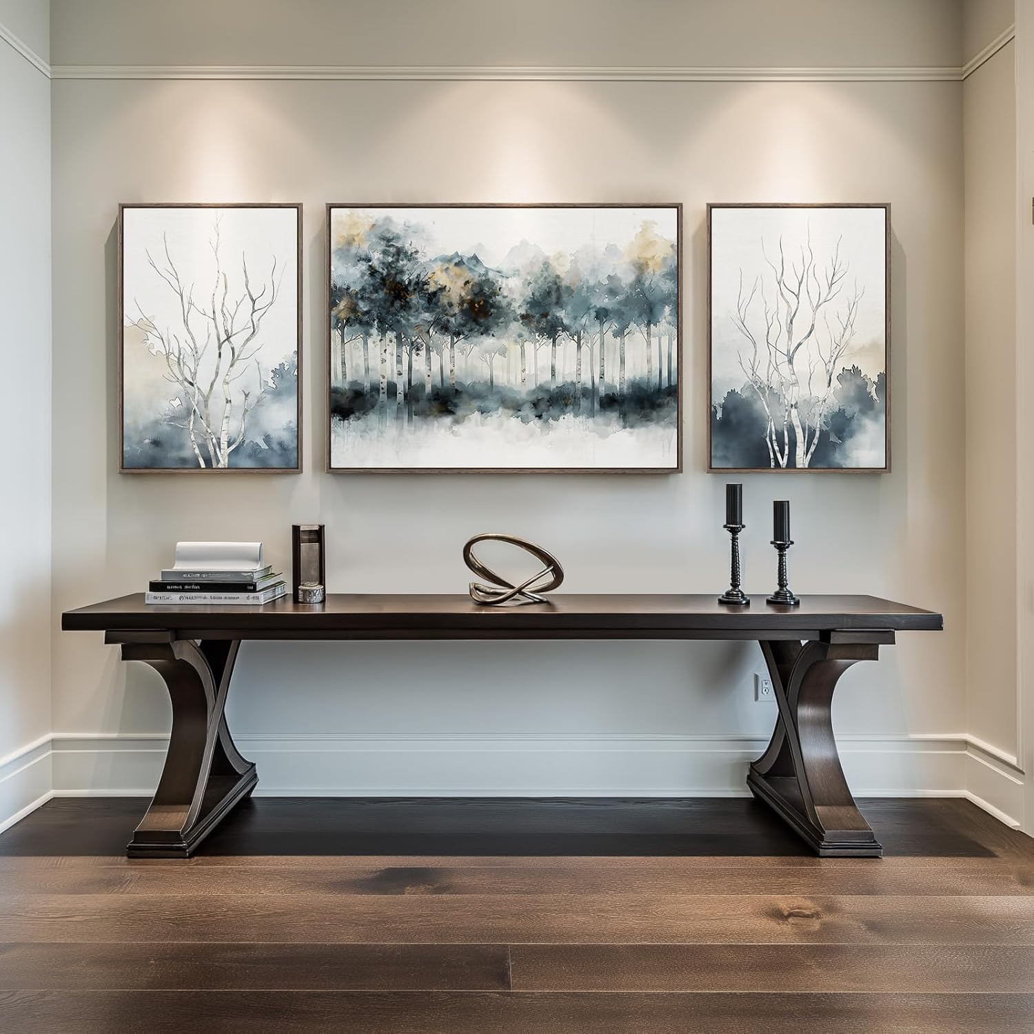 [Modern And Elegant Wall Decor]: This triptych wall art features a serene abstract forest landscape, where delicate watercolor strokes in soft shades of light and dark blue blend harmoniously. The light use of grey evokes a subtle, foggy atmosphere, creating a sense of calm and serenity. This modern and elegant artwork brings tranquility and a peaceful ambiance to any living space. Perfect for living rooms, bedrooms, kitchens, dining rooms, hallways, stairs, studies, offices, bathrooms, or any space that needs a touch of nature’s serene beauty