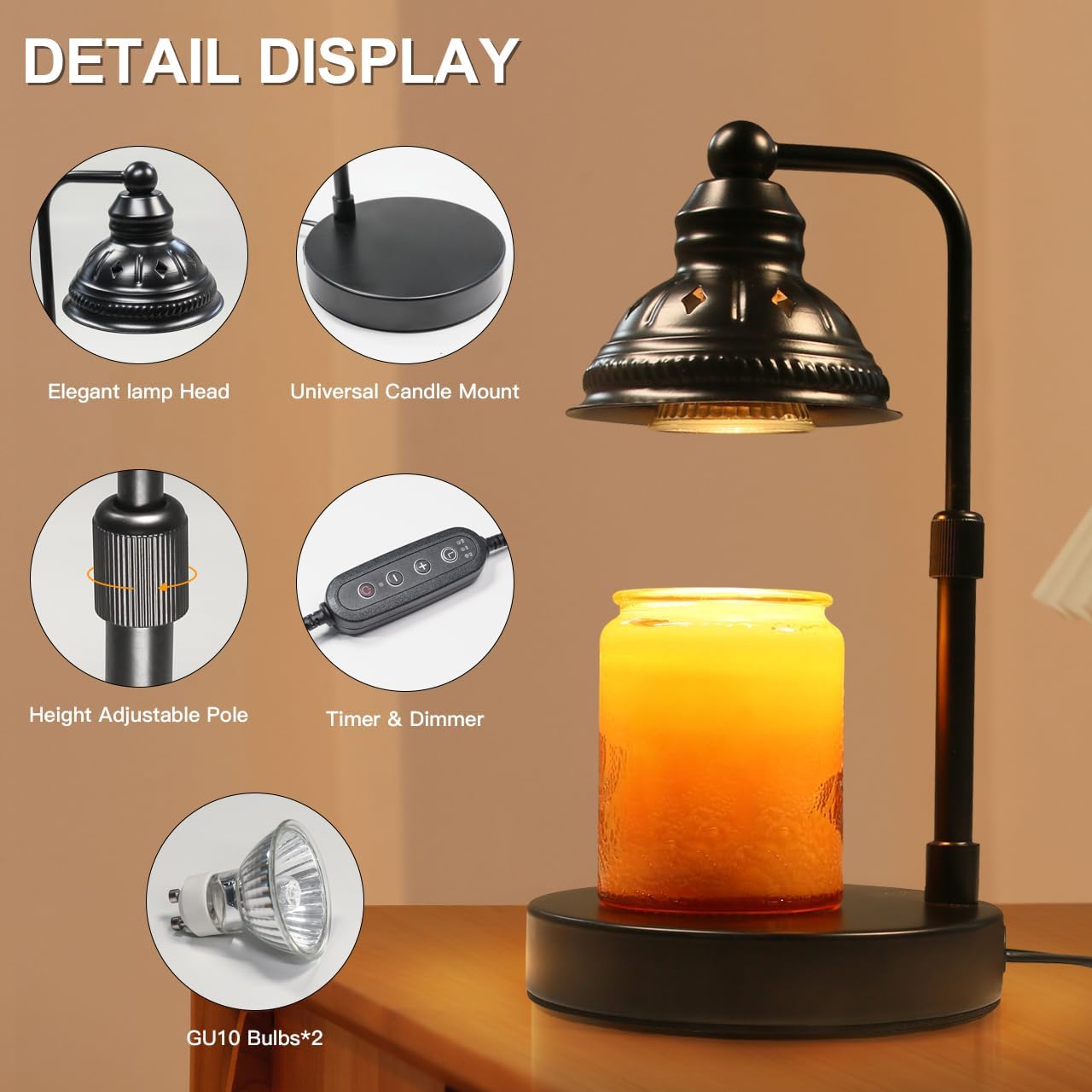 VERSATILE DESIGN: Adjustable height lamp with classic black finish and decorative dome shade perfect for warming candles safely
