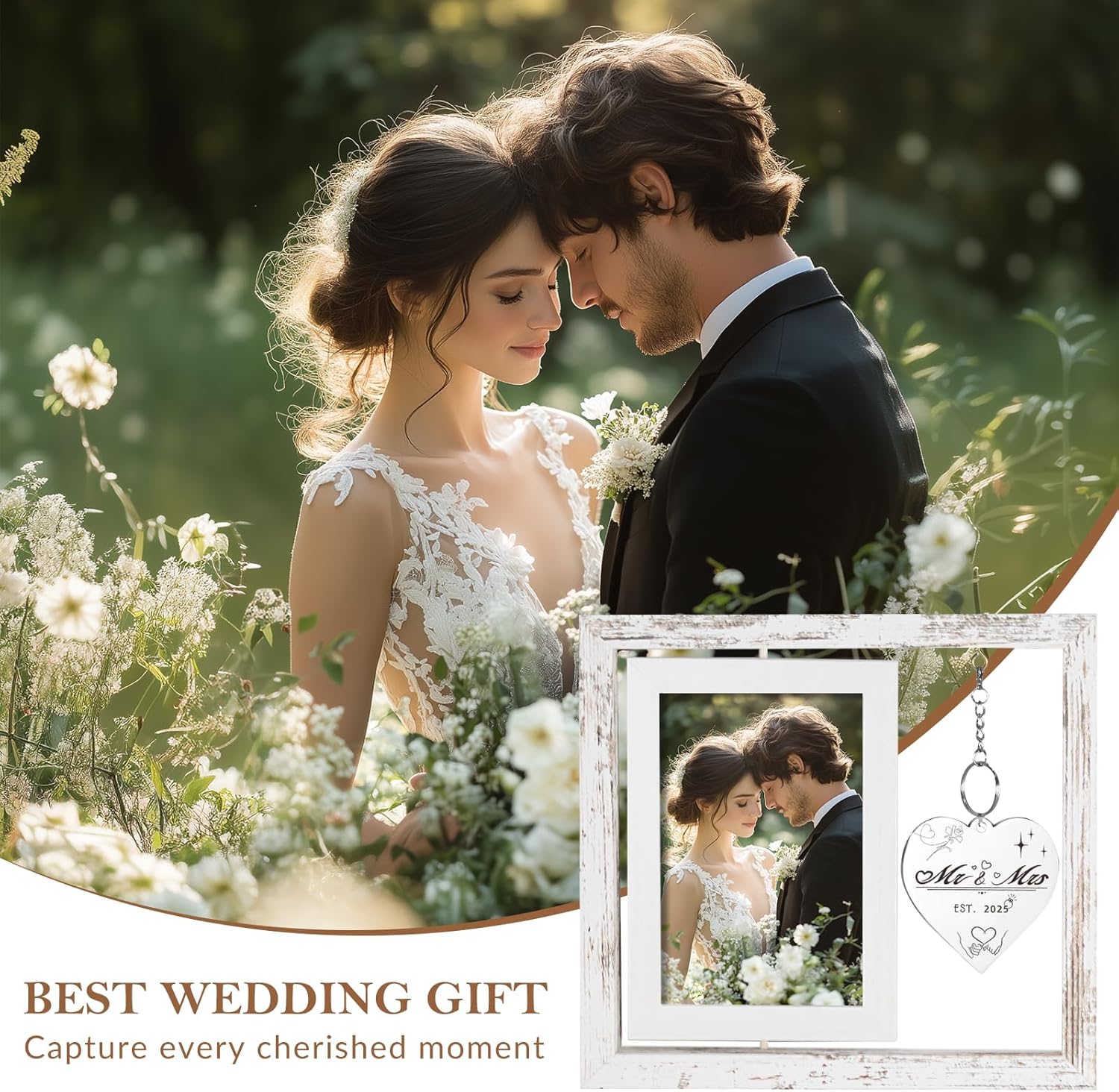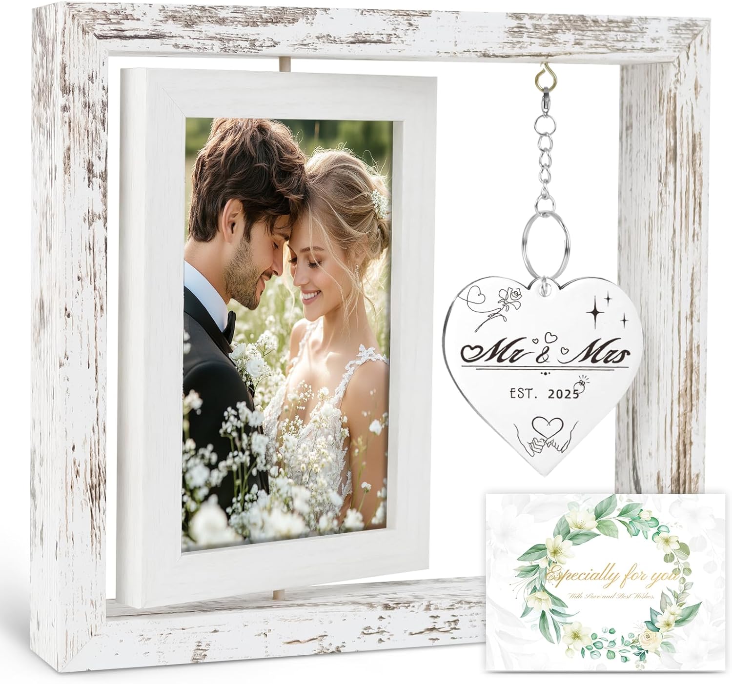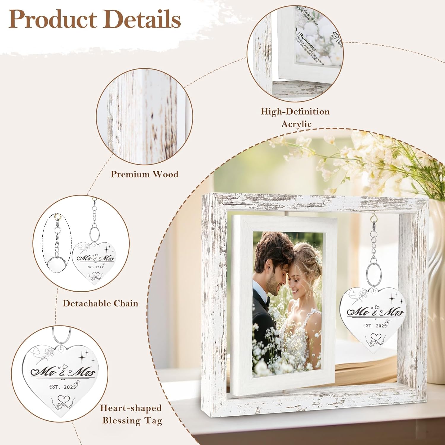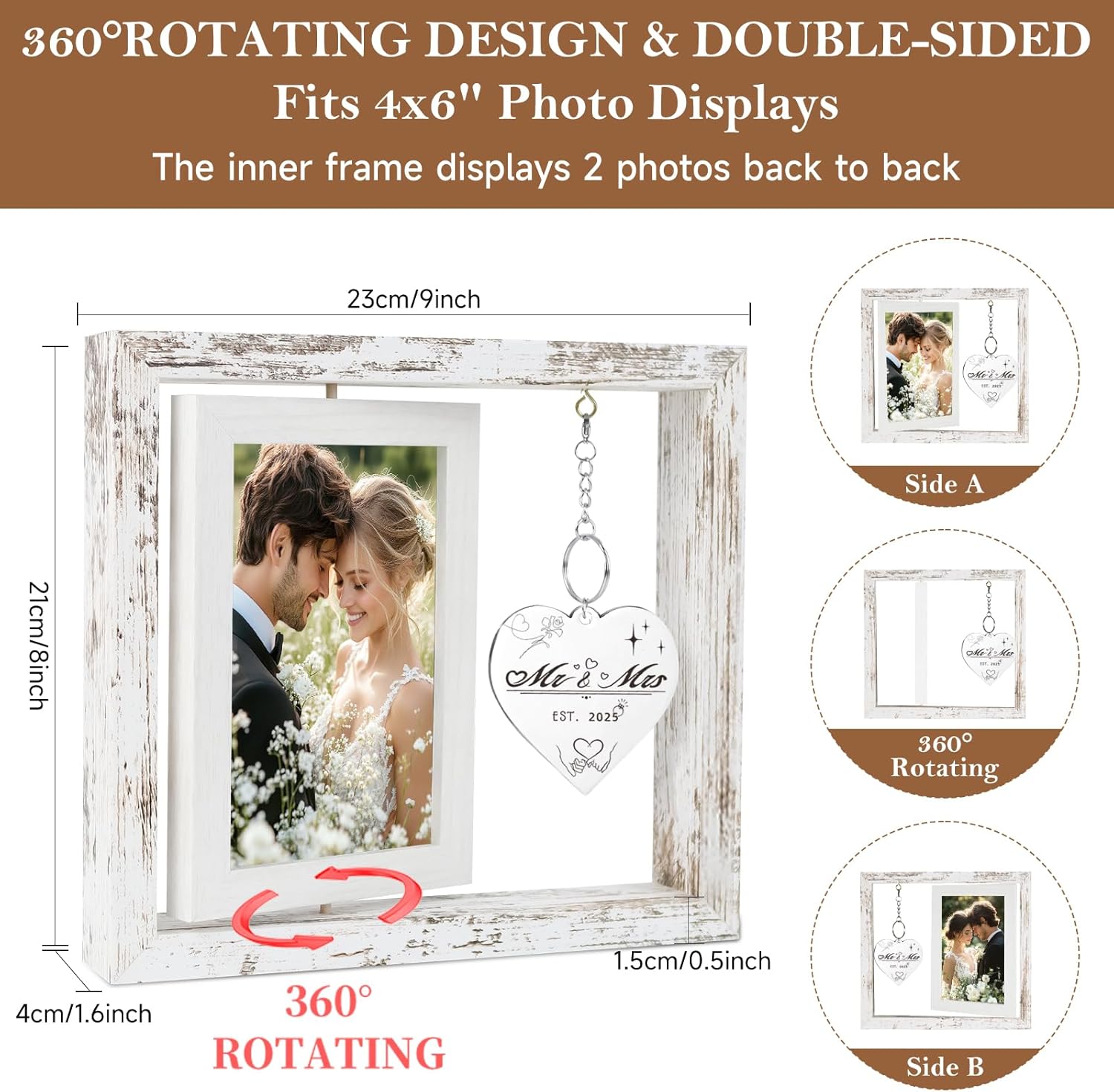 Cute Bridal Shower Gift for Bride: Crafted from lightweight wood, this wedding frame boasts a natural retro white wood veneer and features a 360° rotating design. Protected by a high-definition clear acrylic cover. The sophisticated heart-shaped pendant, made of metal, enhances its elegance. This wedding photo frame is the perfect keepsake to display your love story and cherished memories.