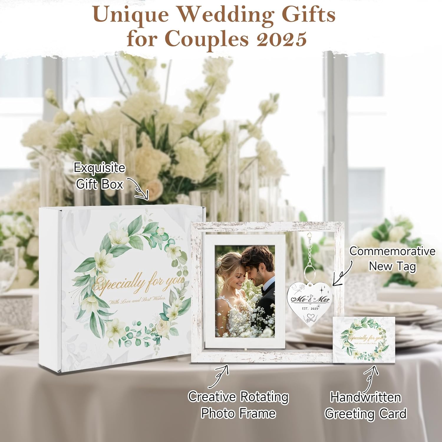 Creative Wedding Gifts: This innovative double sided rotating photo frame can display two pictures at once, showcasing your unique and precious memories. The meticulously designed heart-shaped Metal pendant, engraved with “Mr & Mrs EST 2025,” marks the beginning of sweet love and symbolizes eternal affection. Our wedding photo frame captures and preserves beloved moments for couples.