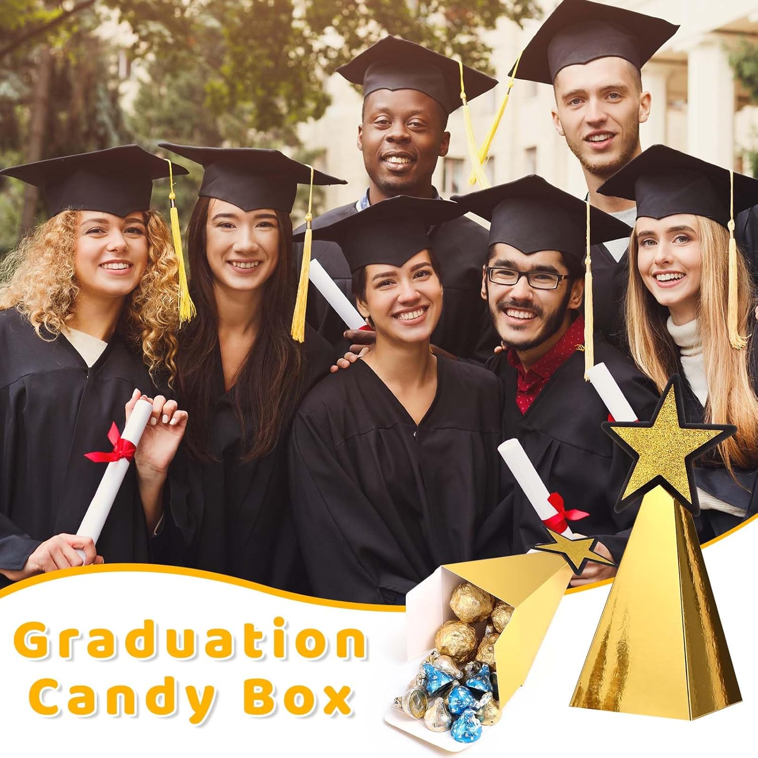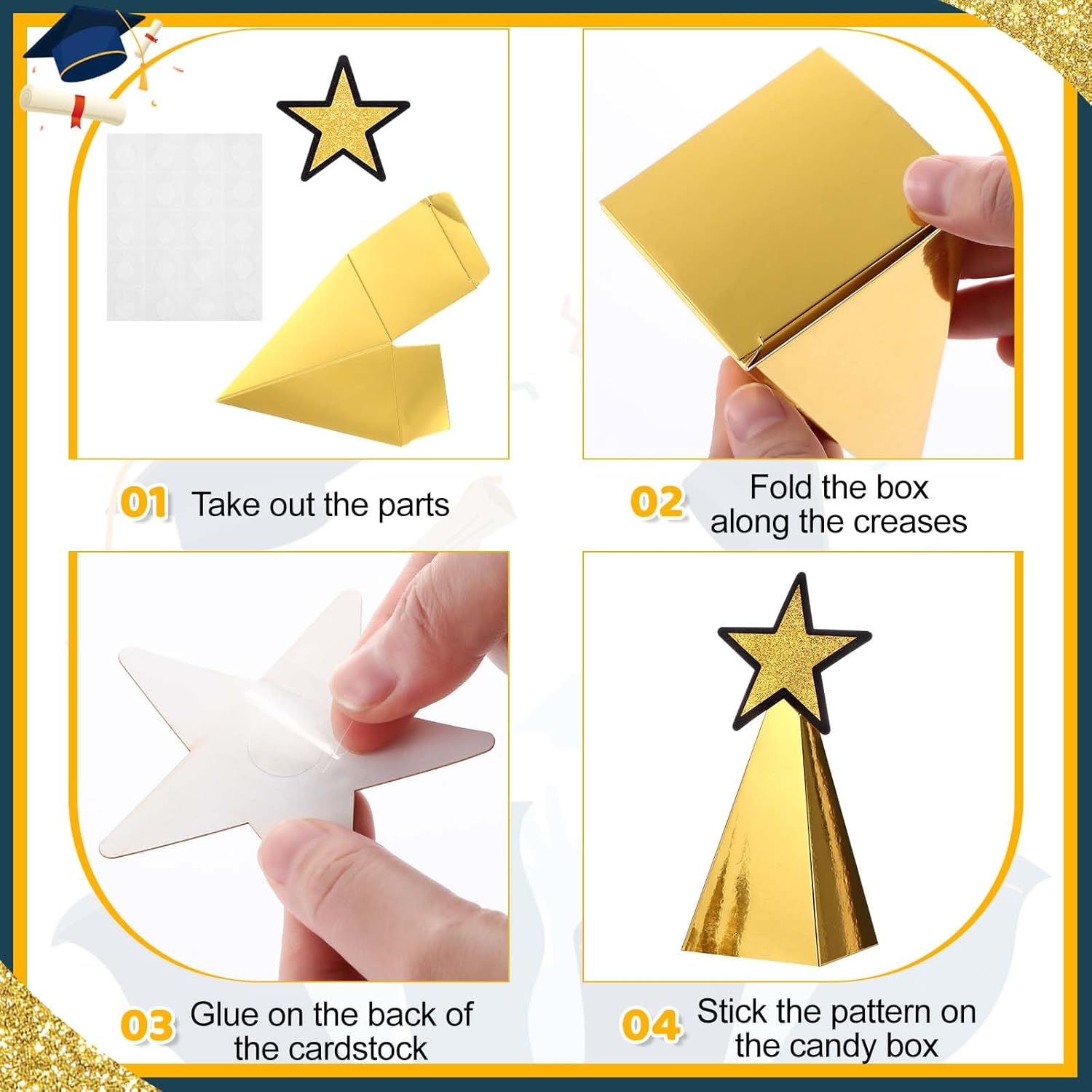 What You Get: you will receive 30 pieces of gold glitter paper boxes, 30 pieces of star card stock and 30 pieces of stickers; You can make a distinctive graduation star trophy candy box for your graduation party decorations and put candies, chocolates and other snacks in the box