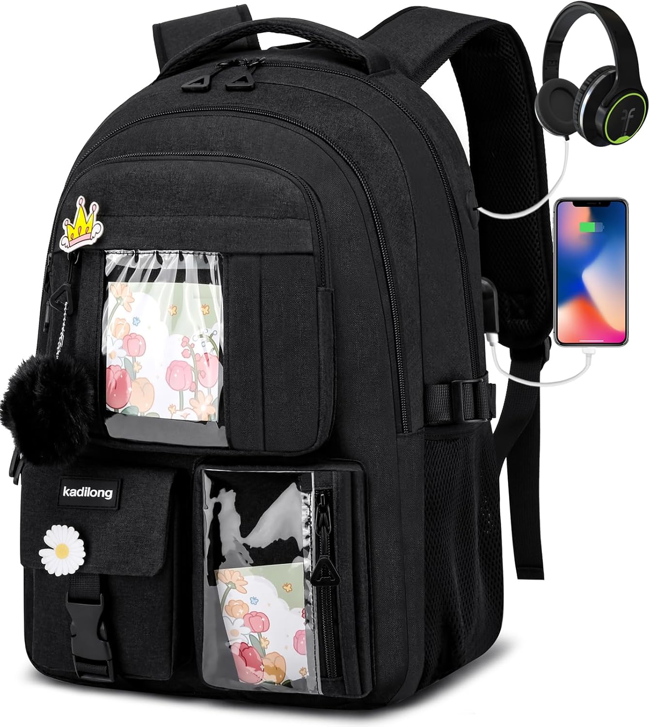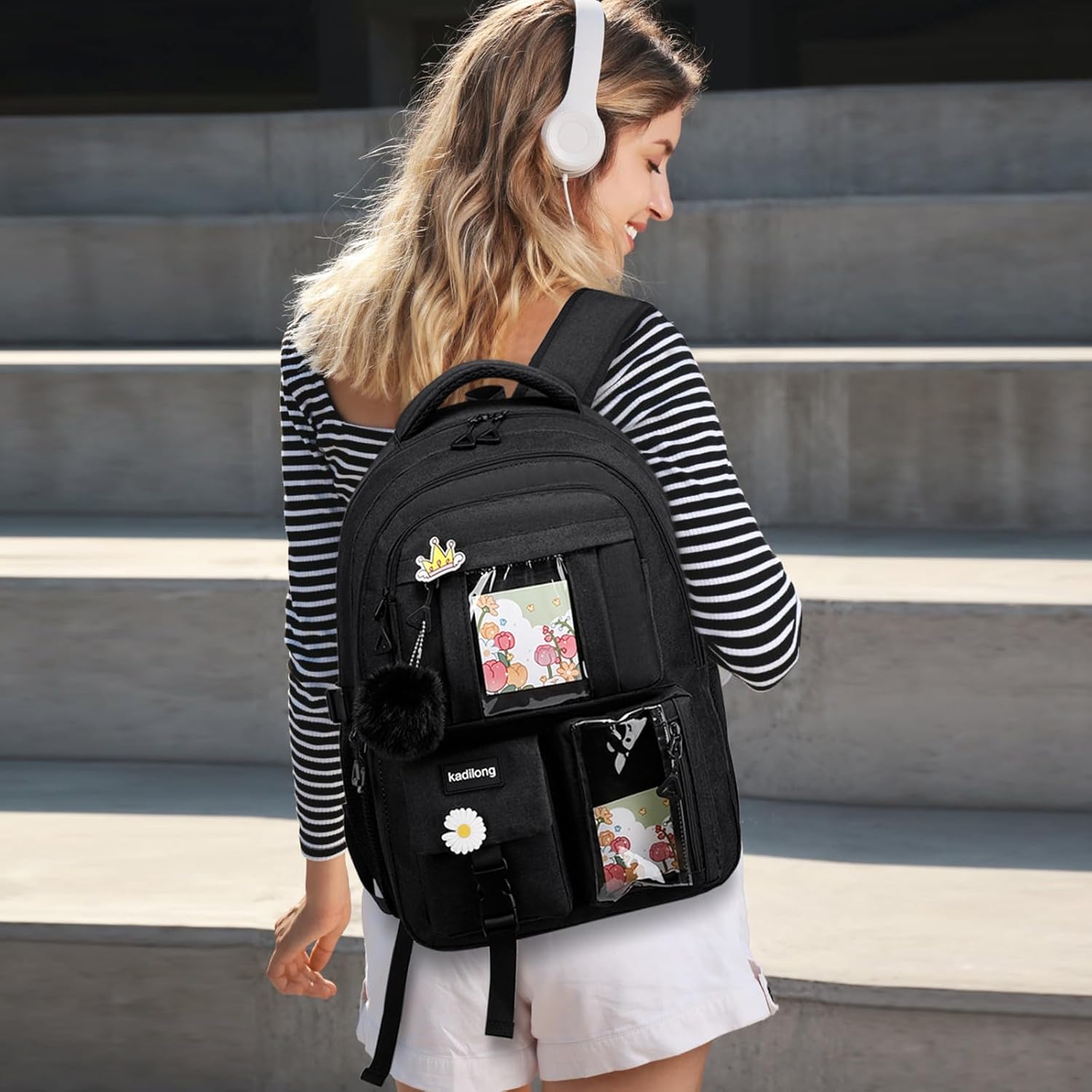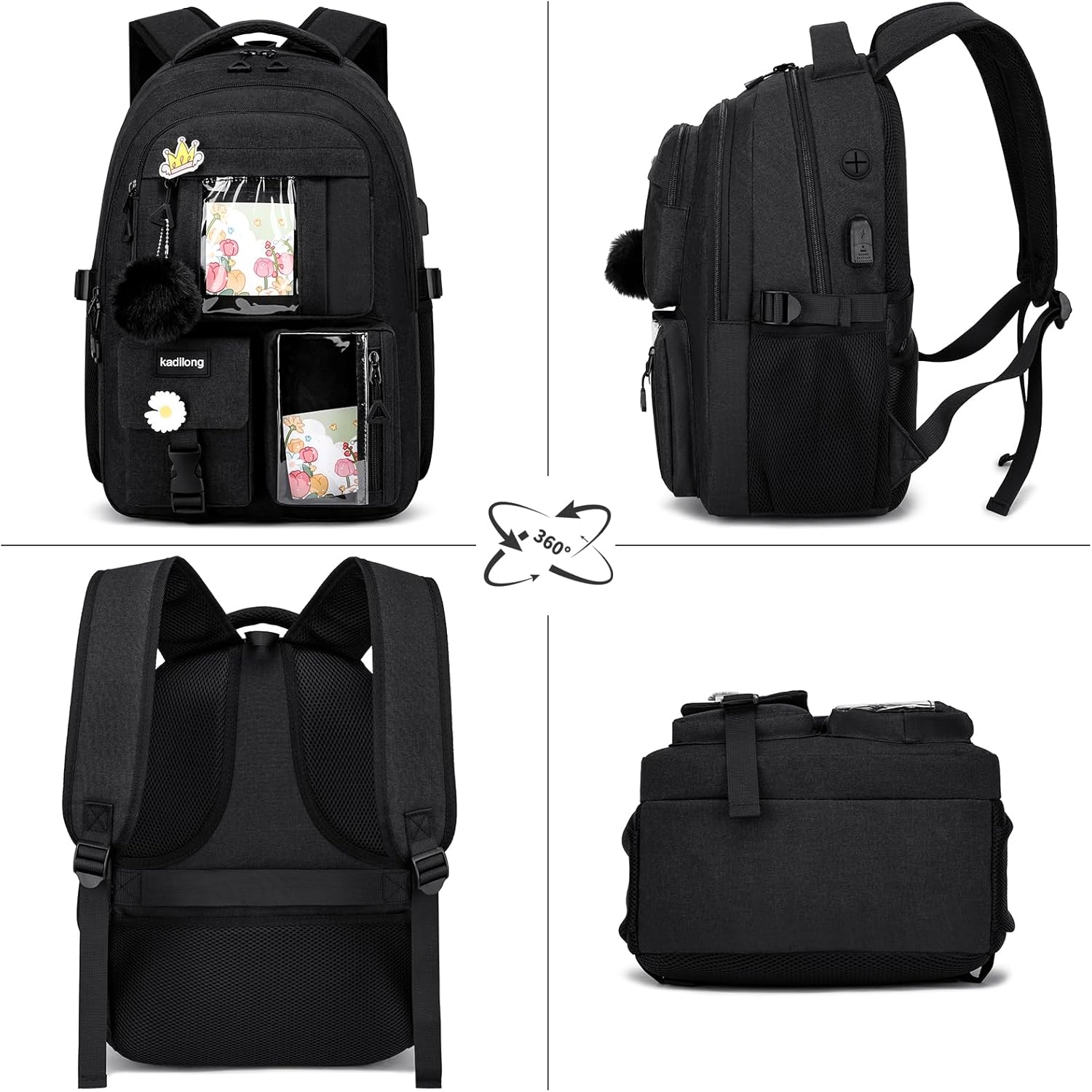 【Well-Organized Pockets】: This backpack for school has 5 separate different compartments and two side pockets to meet your daily storage. 1 separate laptop compartment includes laptop padded sleeve with elastic belt. The front tool compartment also comes with multiple slots to provide roomy space for necessities. The front 3 pockets can hold charge device and other small items, convenient for your daily organization. 2 side pockets for water bottles and umbrellas.