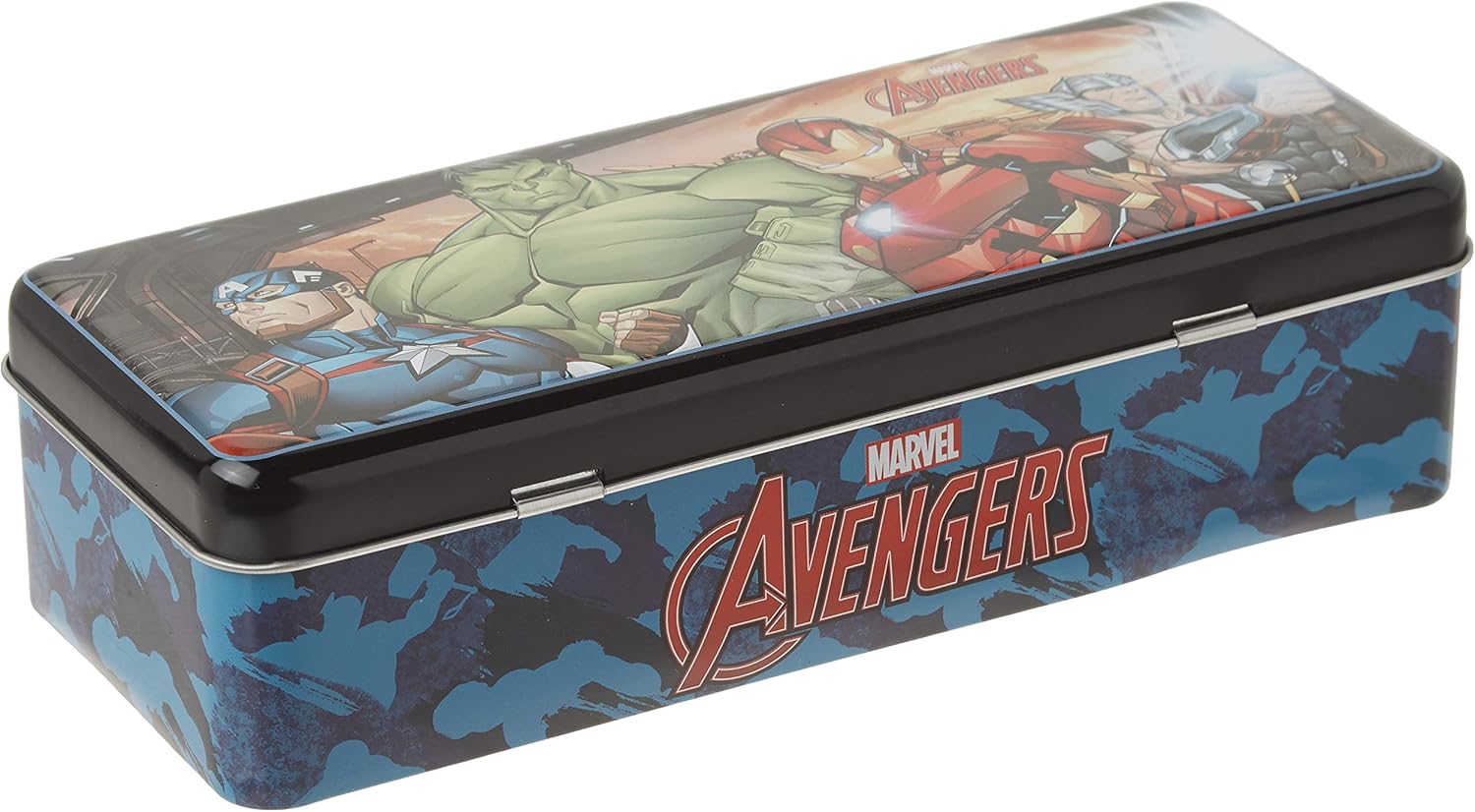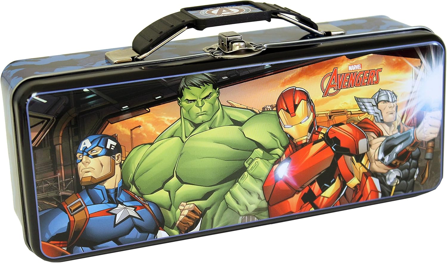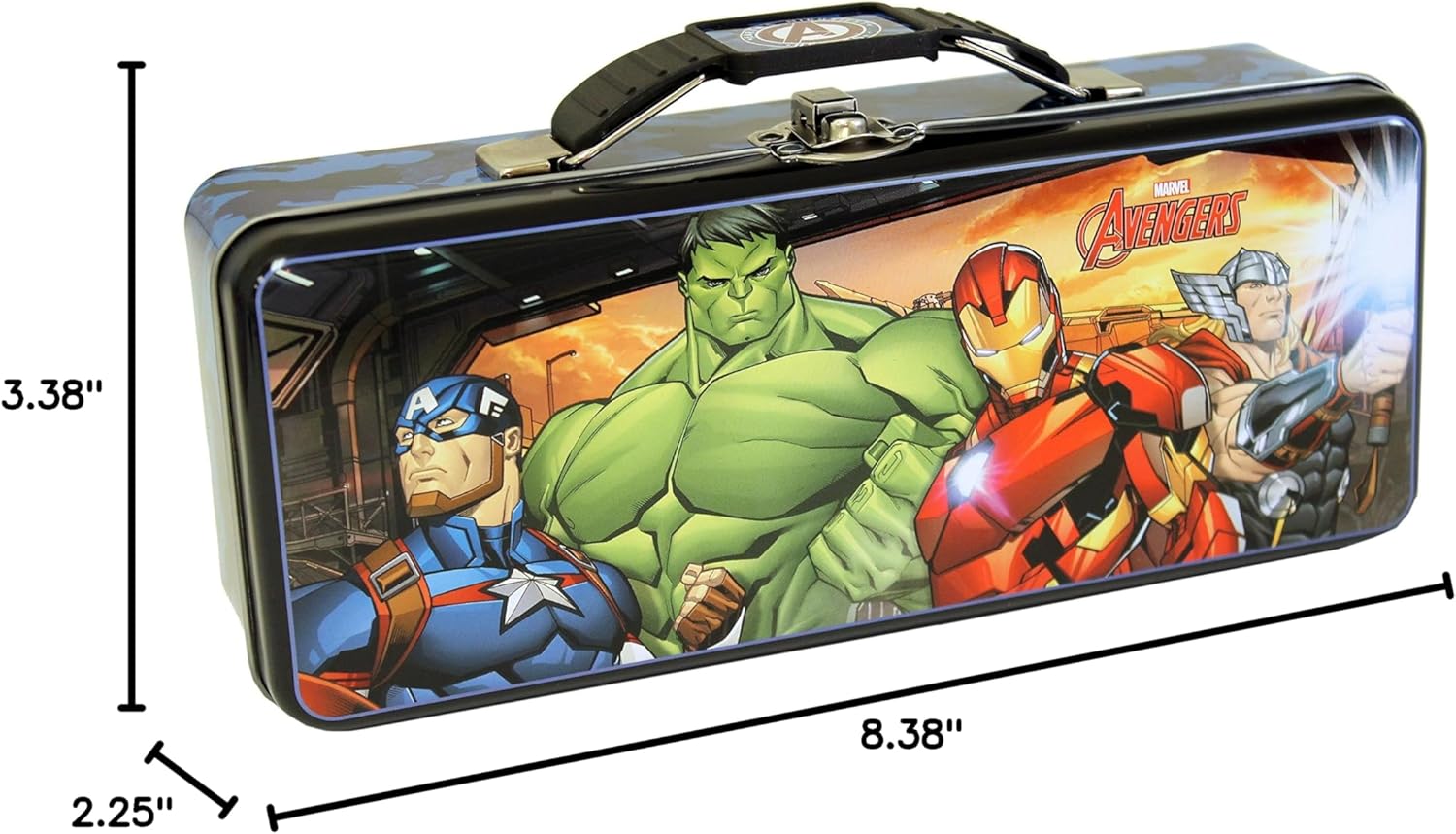 Unique tin carry all offered by The Tin Box Company for pencil and crayon storage. Features include a clasp, hinge and beaded handle. Great for storage of pencils and school supplies. Featuring Marvel’s Avengers