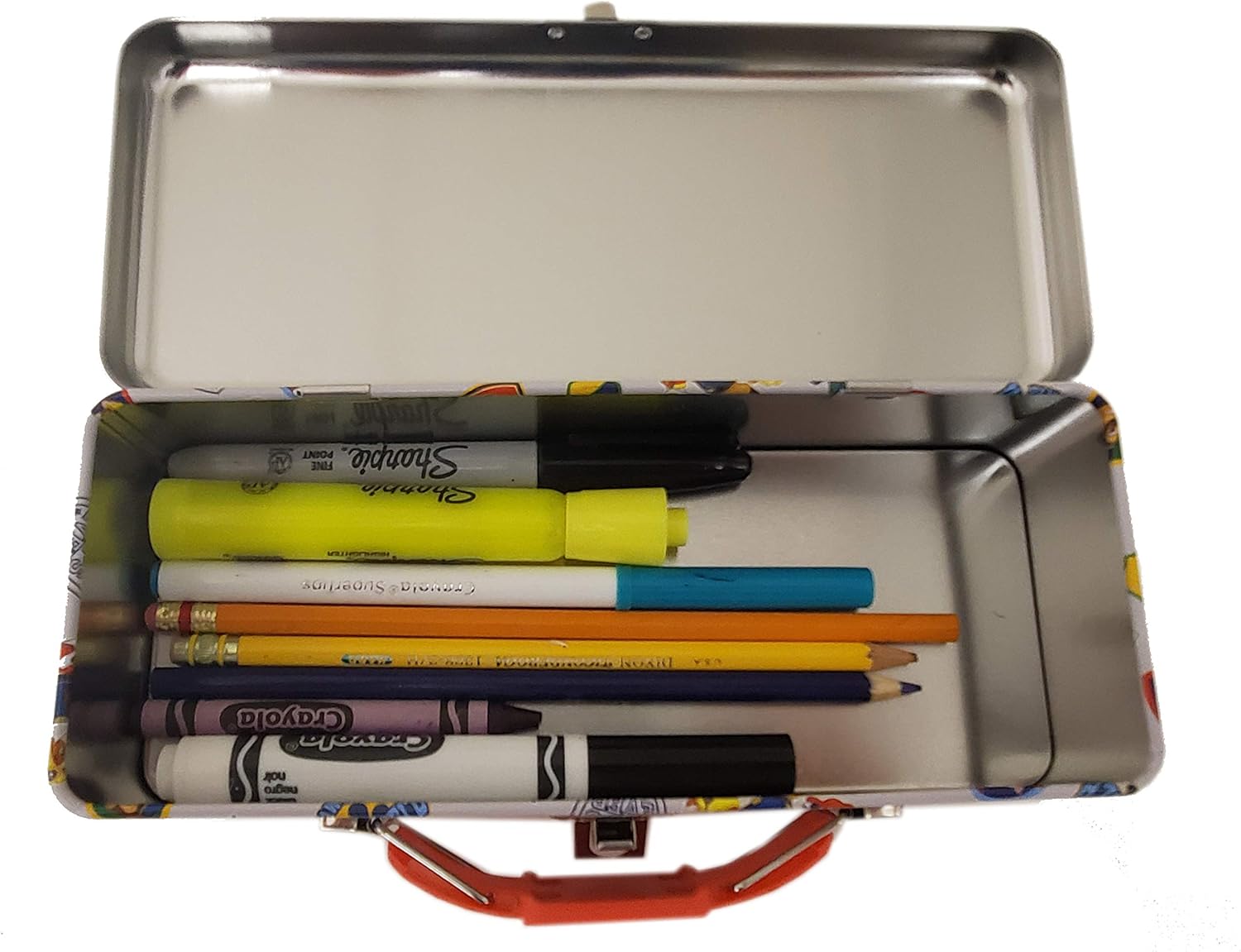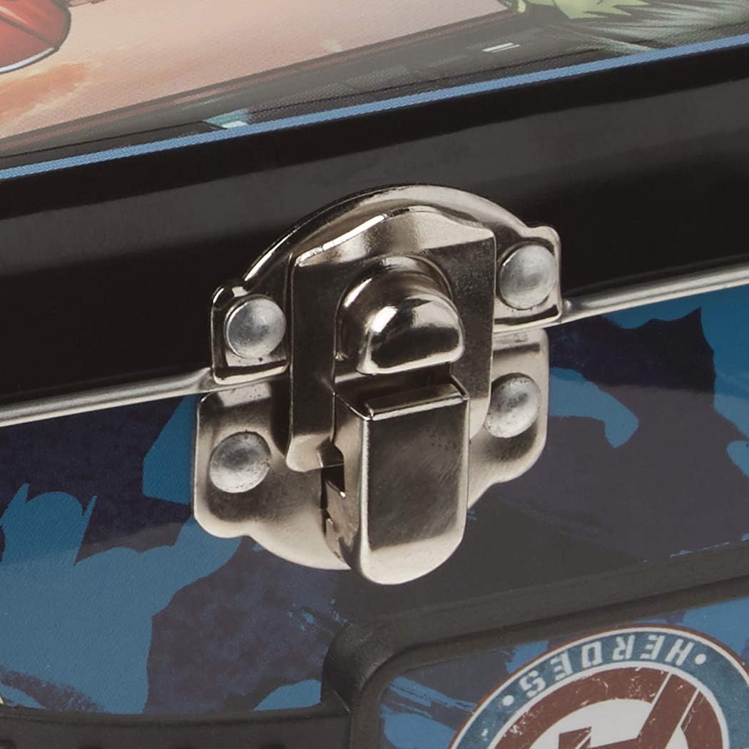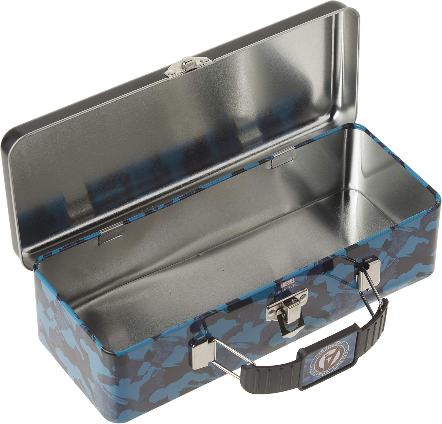 Unique tin carry all offered by The Tin Box Company for pencil and crayon storage. Features include a clasp, hinge and beaded handle. Great for storage of pencils and school supplies. Featuring Marvel’s Avengers