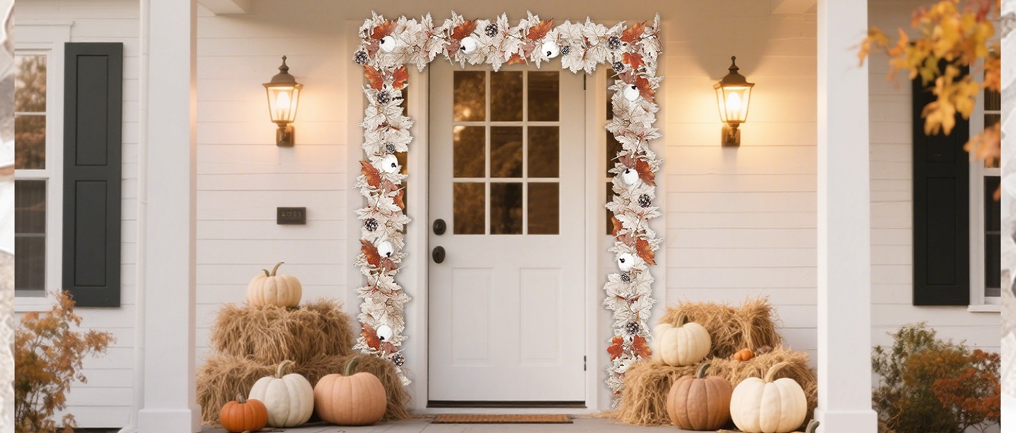 Waterproof Materials: The fall maples leaves garland Lights are crafted from silk fabric, waterproof and fade-resistant, suitable for both indoor and outdoor use. These modern-styled grey-white maples leaves are an good choice for fall home decor